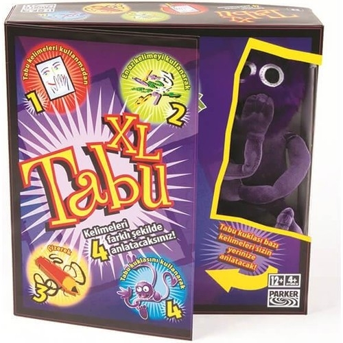 Oyun partilerinin vazgeçilmezi Tabu XL sizlerle! Tabu XL'da tam 4 farklı anlatım şekli var. Klasik Oyunun yanı sıra çizerek, Tabu kuklasıyla anlatarak ve en fazla 15 kelime kullanarak oynayacağınız Tabu XL ile oyun partileri çok eğlenceli geçecek. Herkesin istediği takımda yer aldığı iki ayrı grup ile başlanan oyunda aşamalar ve zorluk dereceleri katlanarak artıyor. Her bir oyun için anlatılacak kelimelerin ayrıldığı A, B, C, D bölümleri ile oyun sürekli kendini yenilemiş oluyor. Oyun alanında ilerledikçe 15 kelime kullanılarak anlatılan bölüm ile artan baskıya karşı koyma gücünüz sınanıyor. Çizerek anlatılan bölümde anlatmanız gereken kelimeyi çizerek anlatmaya başlıyorsunuz. Hafıza bölümünde iki ipucu kullanarak anlatıyorsunuz. Kukla kullanarak anlattığınız bölümde ise kuklayı sessiz sinema oynatır gibi kullanıyorsunuz. Kutu içerisinde; 252 kart, 2 adet piyon, tabu kuklası, oyun alanı, kum saati, çizim defteri ve oyun kılavuzu yer almaktadır. Oyuncu sayısı: 4 veya daha fazla Kutu ölçüsü: 27 x 9 x 27 cm